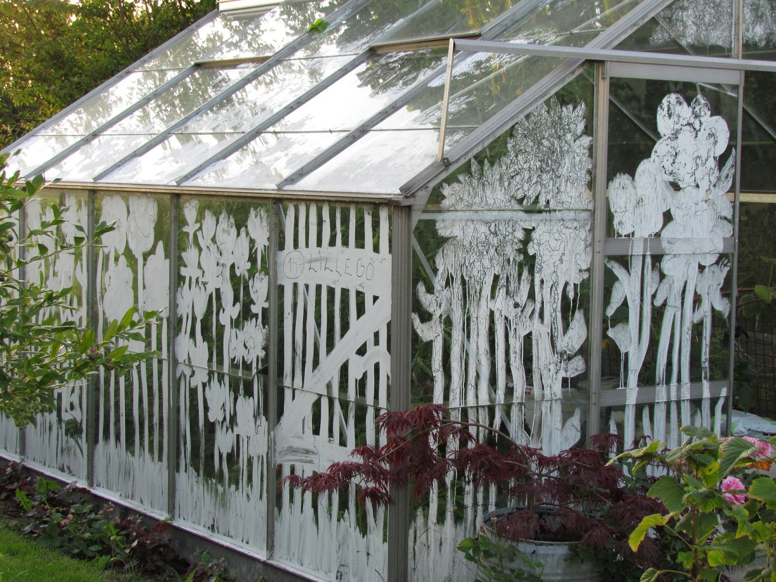 Men ingen af de tidligere sensomre har bragt mig samme følelse af succes som denne. Det er tæt på at føles som en åbenbaring. I foråret så jeg tilfældigvis på Facebook et drivhus, som var bemalet med skyggepasta. Ikke bare tilkalkede ruder, men derimod var penslen svunget i blomstermotiver. Og dá var jeg solgt! Jeg havde ikke ro på mig, før jeg fik fundet bøtten med skyggepasta, som havde stået uåbnet, siden drivhuset blev købt og opstillet. En mængde skyggepasta blev blandet op med vand efter forskrifterne på bøtten og en pensel fundet frem.