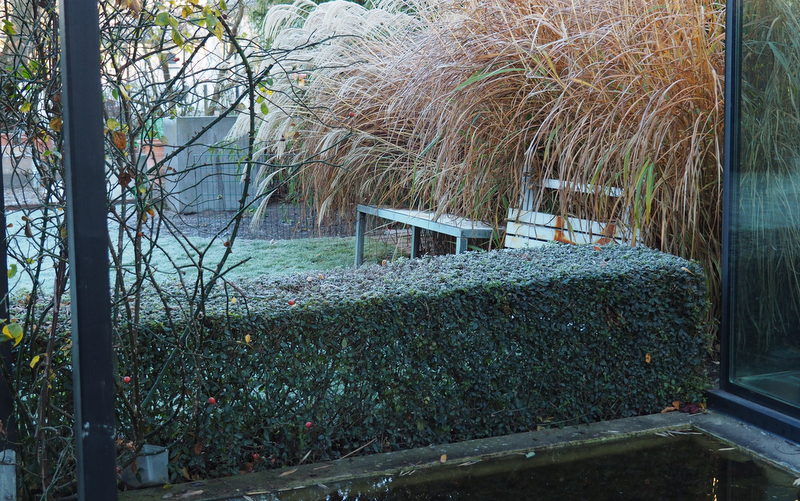 Jeg foretrækker en fast struktur i haven. For mig er det vigtigt, at den ikke bliver flad og tynd om vinteren. Mit valg af planter der derfor så vidt muligt de, som trods dårligt vejr kan være fine i deres nøgenhed. Rævehalespireaen – Spiraea × billardii – er formklippet og danner skønne runde kugler, der passer fint til de stramme ligusterhække. De rosa blomster, som kommer om sommeren, klippes ganske enkelt af. Og er de ikke fine selv om vinteren?