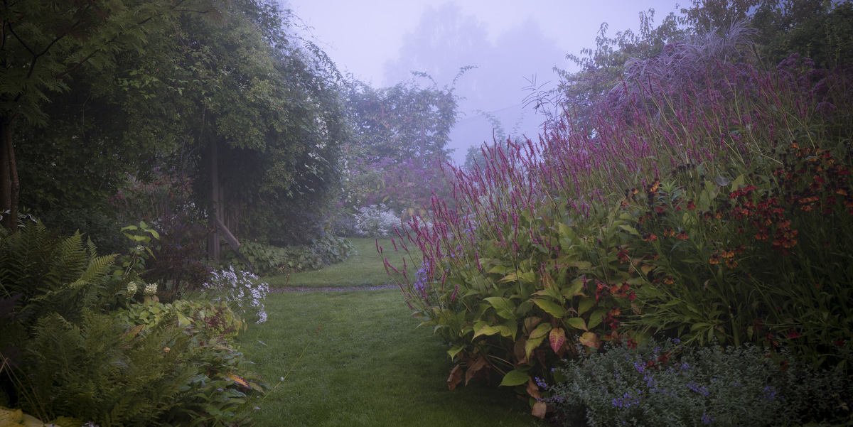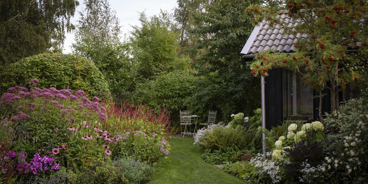 På de mere skyggefulde steder blomstrer hortensiaen Annabelle stadigvæk sammen med skovasters, hvis små hvide blomster ligner lette skyer.