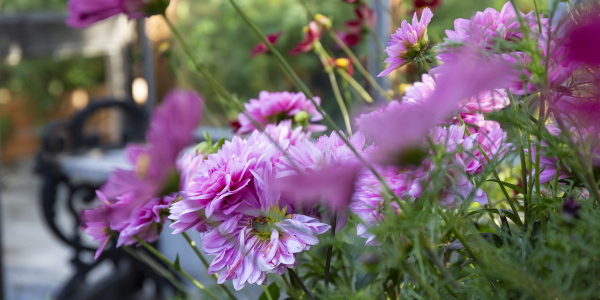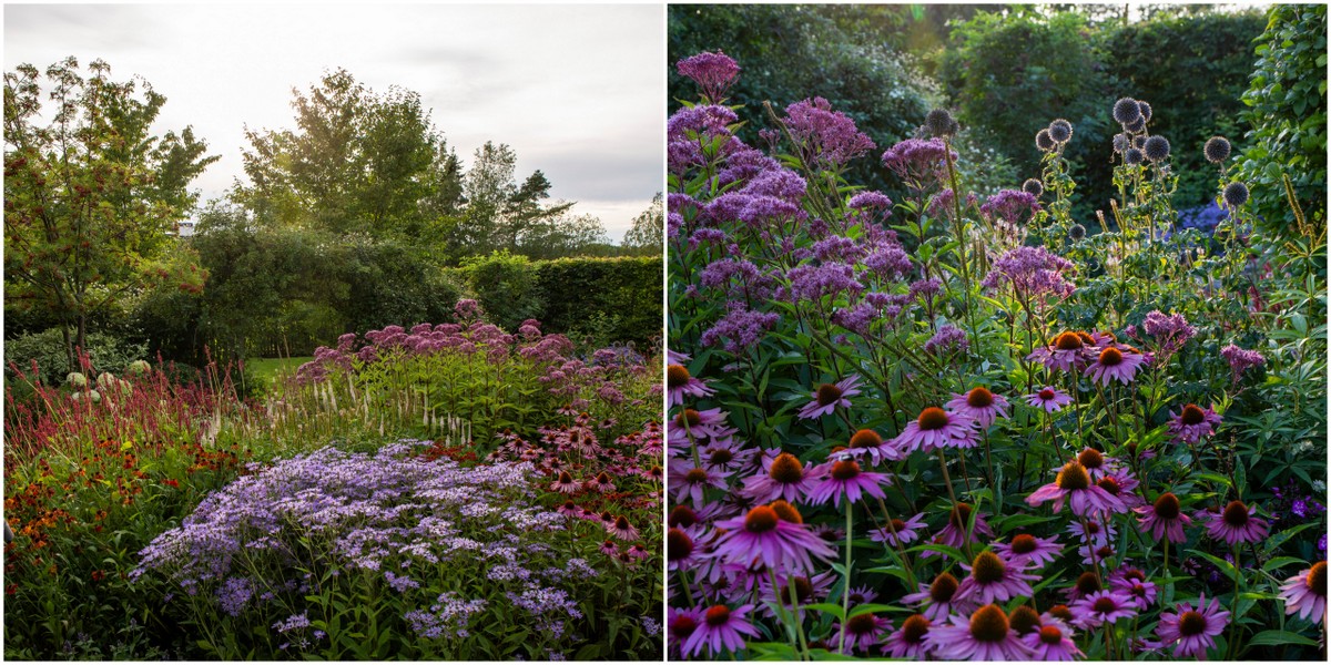 Haven farves stadigvæk af sensommerens stauder. I bedet ved terrassen deles asters, hjortetrøst, purpursolhat, kærtepileurt og efterårsblomstrende katteurt om pladsen. Solhatten begynder at se lidt trist ud, men holder stadigvæk et par uger.